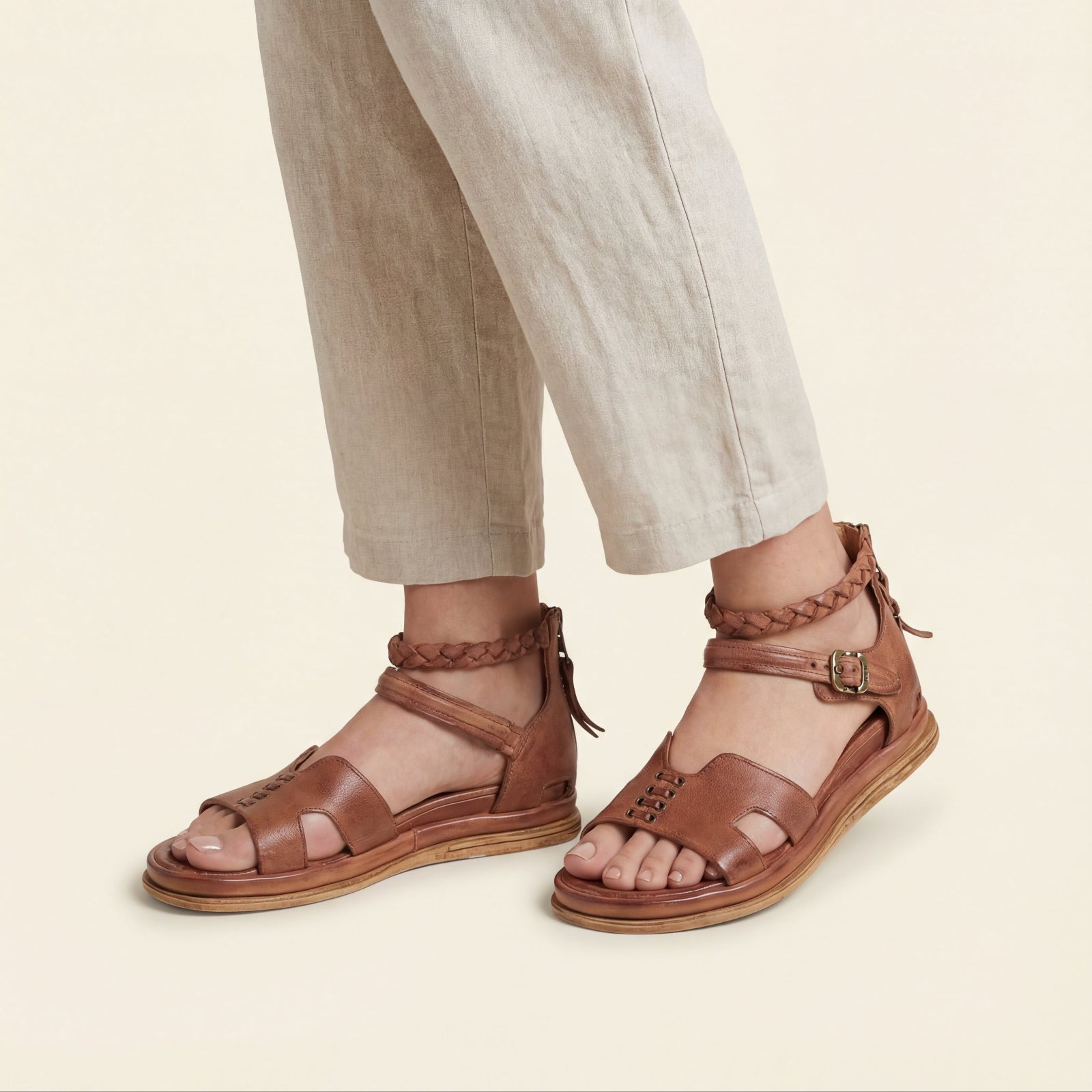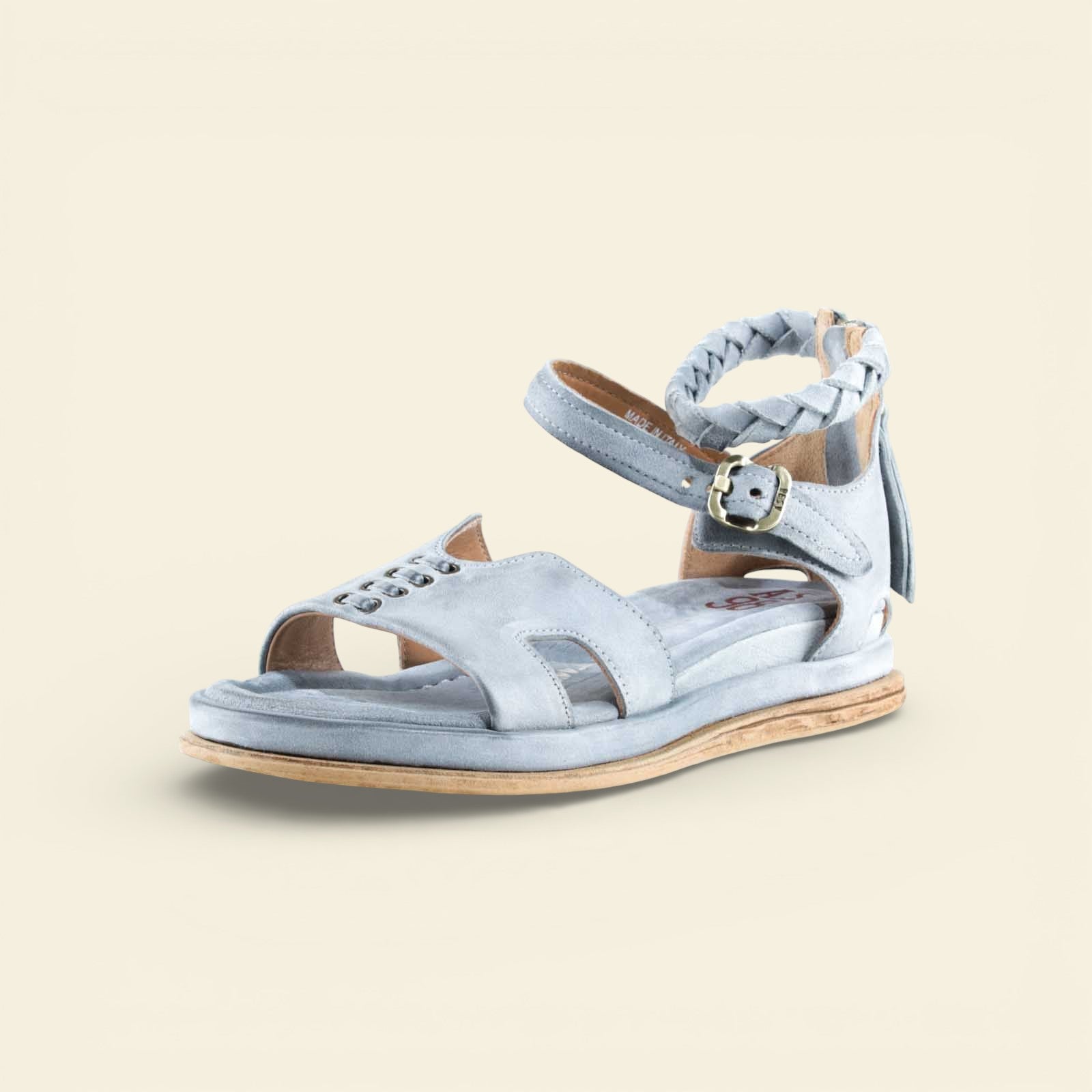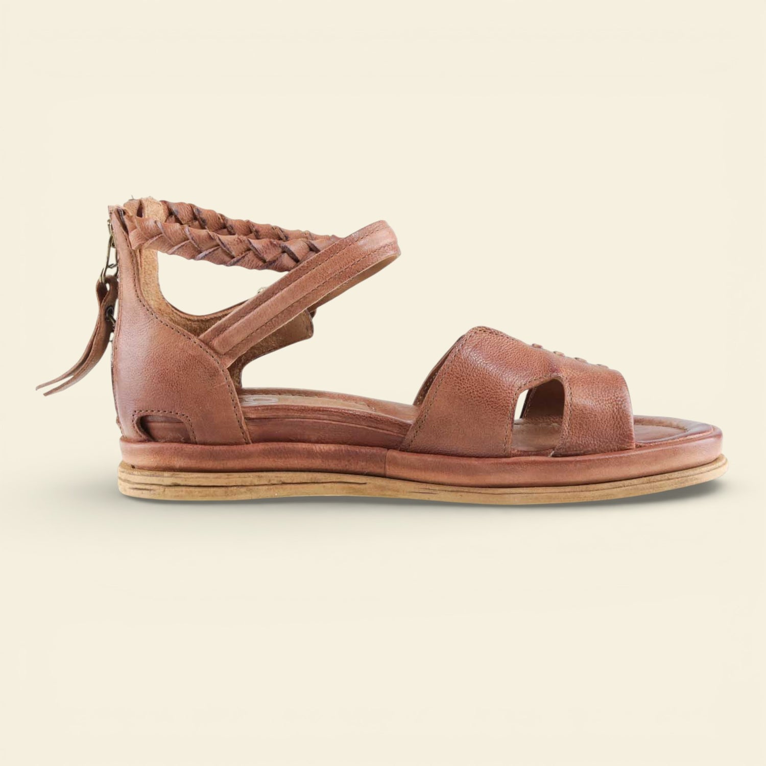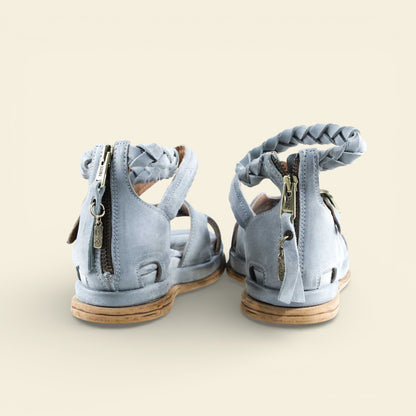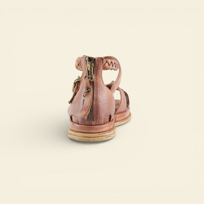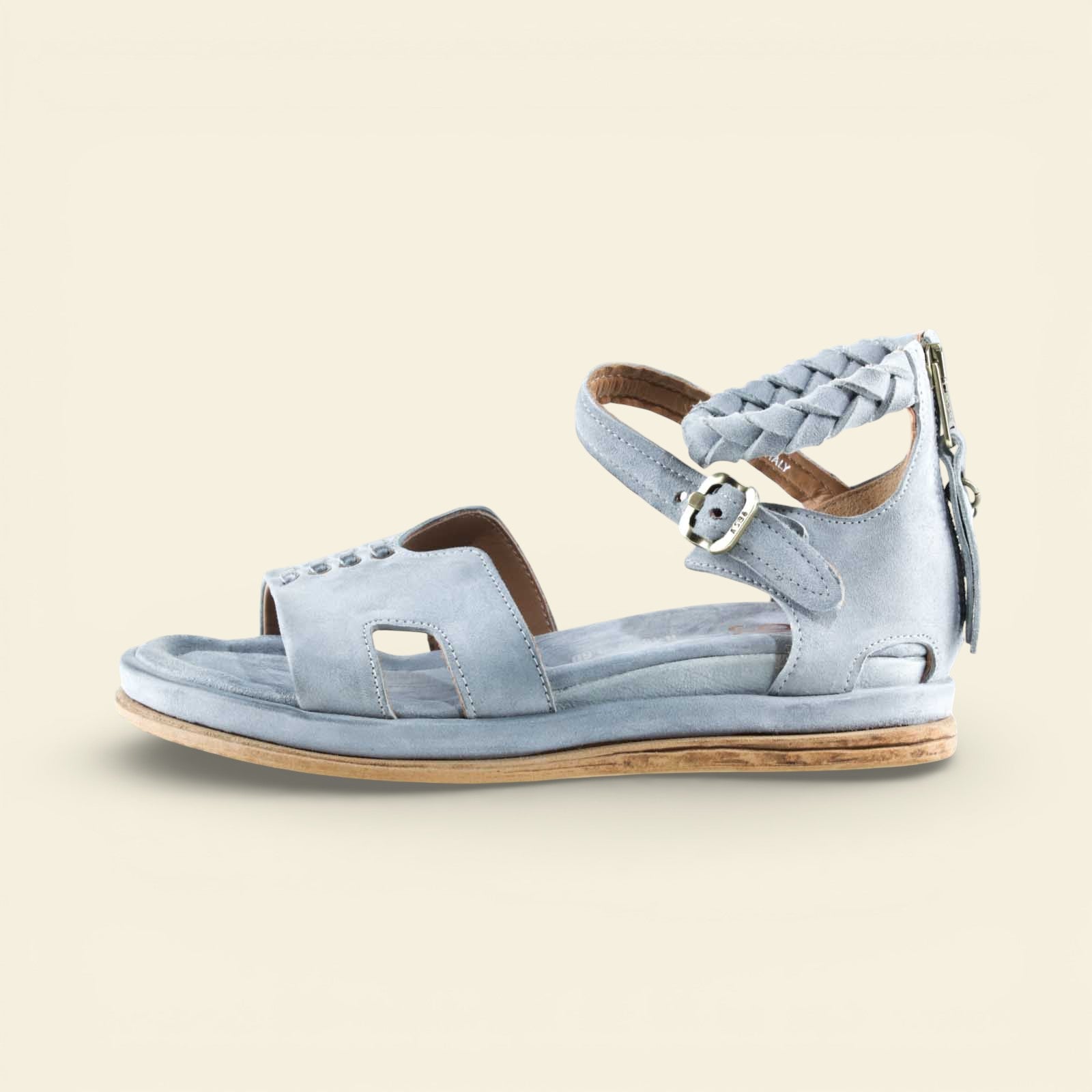 The wide front strap is accented with metal eyelet detailing, while a softly structured upper frames the foot with subtle cutouts. A braided leather ankle strap adds texture and dimension, secured with an adjustable buckle for a personalized fit. At the back, a functional zip closure allows for easy on and off without compromising the clean lines of the design.