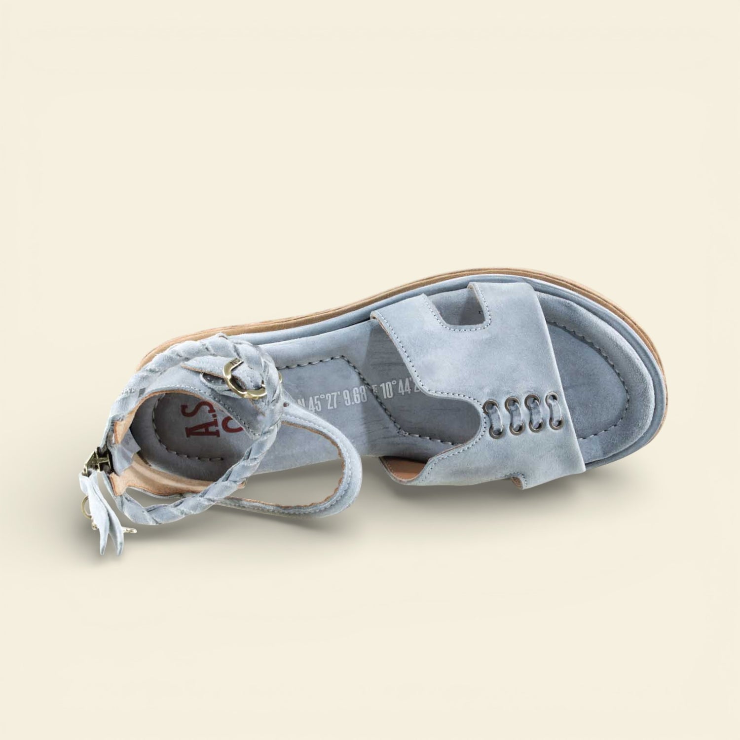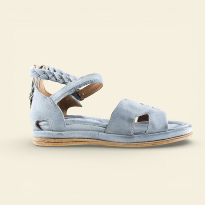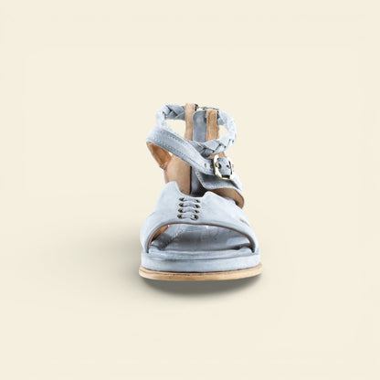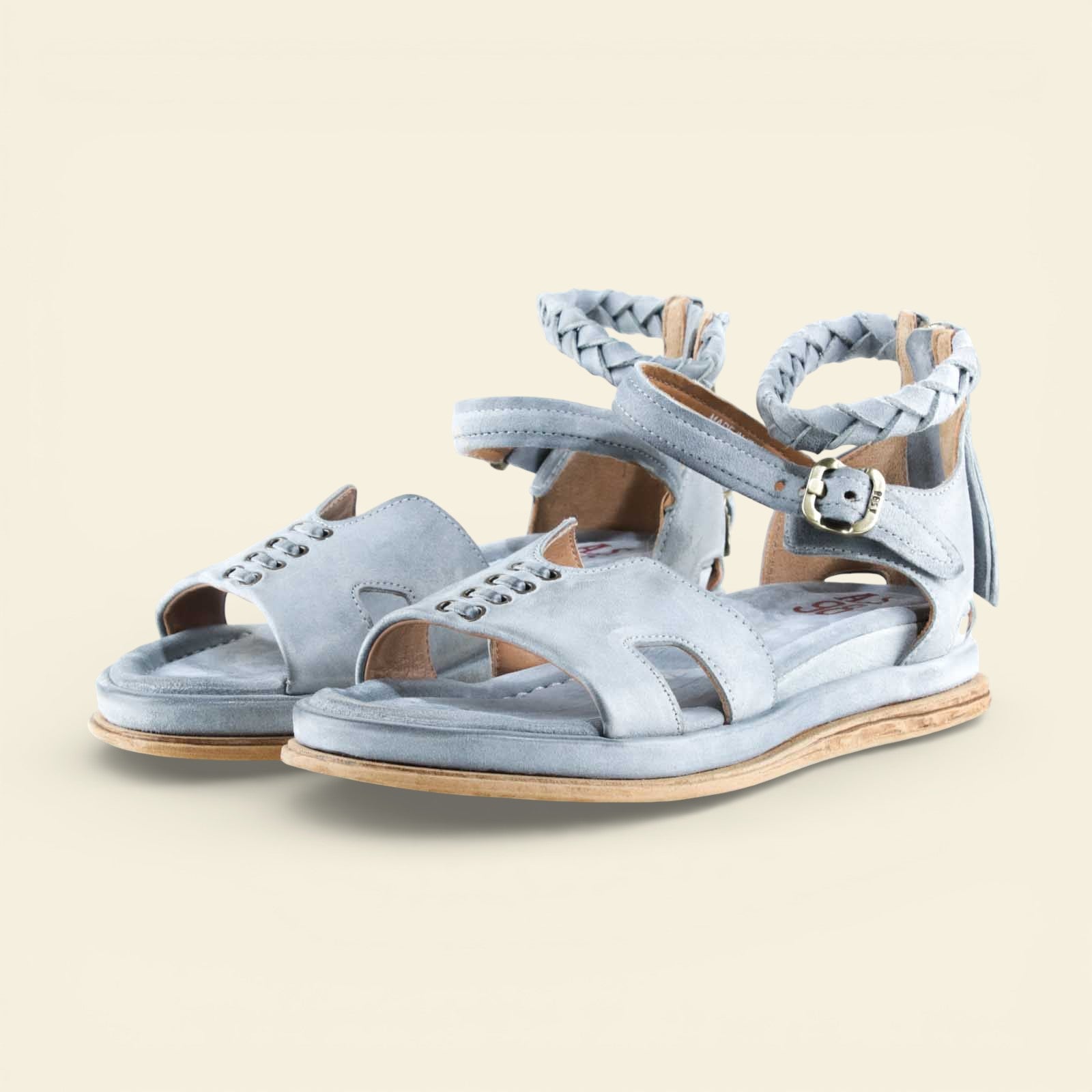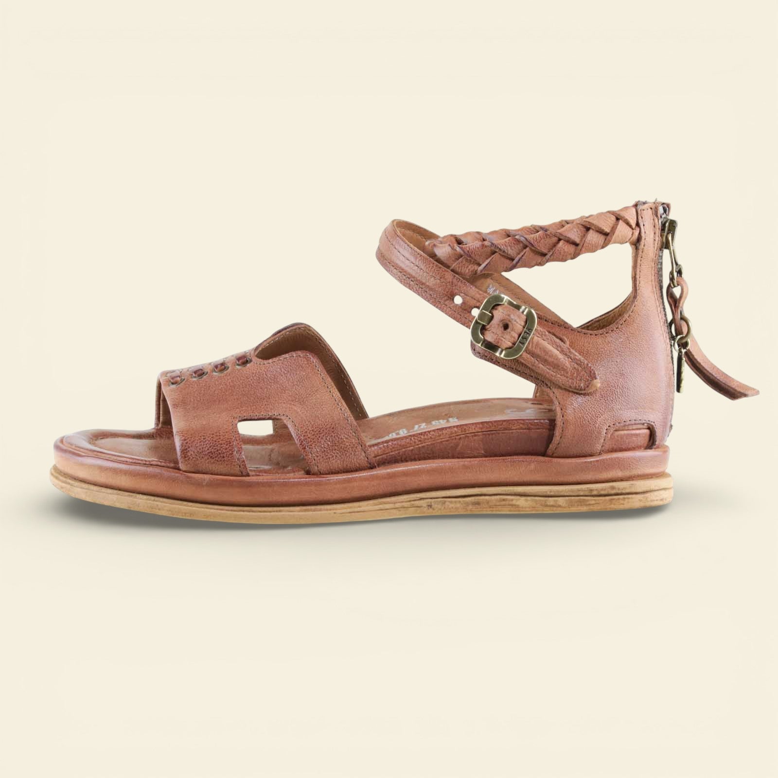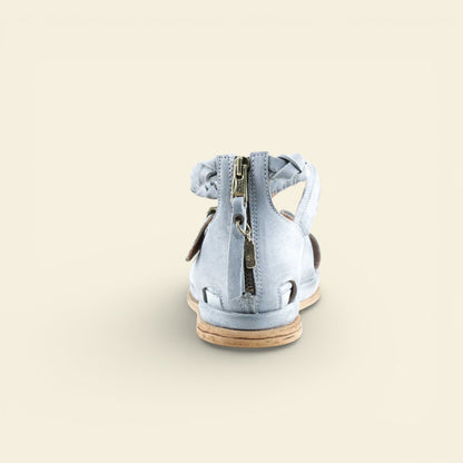 The wide front strap is accented with metal eyelet detailing, while a softly structured upper frames the foot with subtle cutouts. A braided leather ankle strap adds texture and dimension, secured with an adjustable buckle for a personalized fit. At the back, a functional zip closure allows for easy on and off without compromising the clean lines of the design.