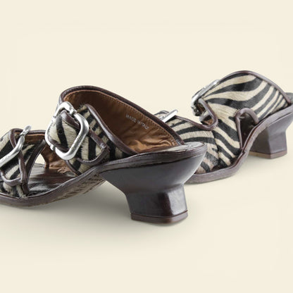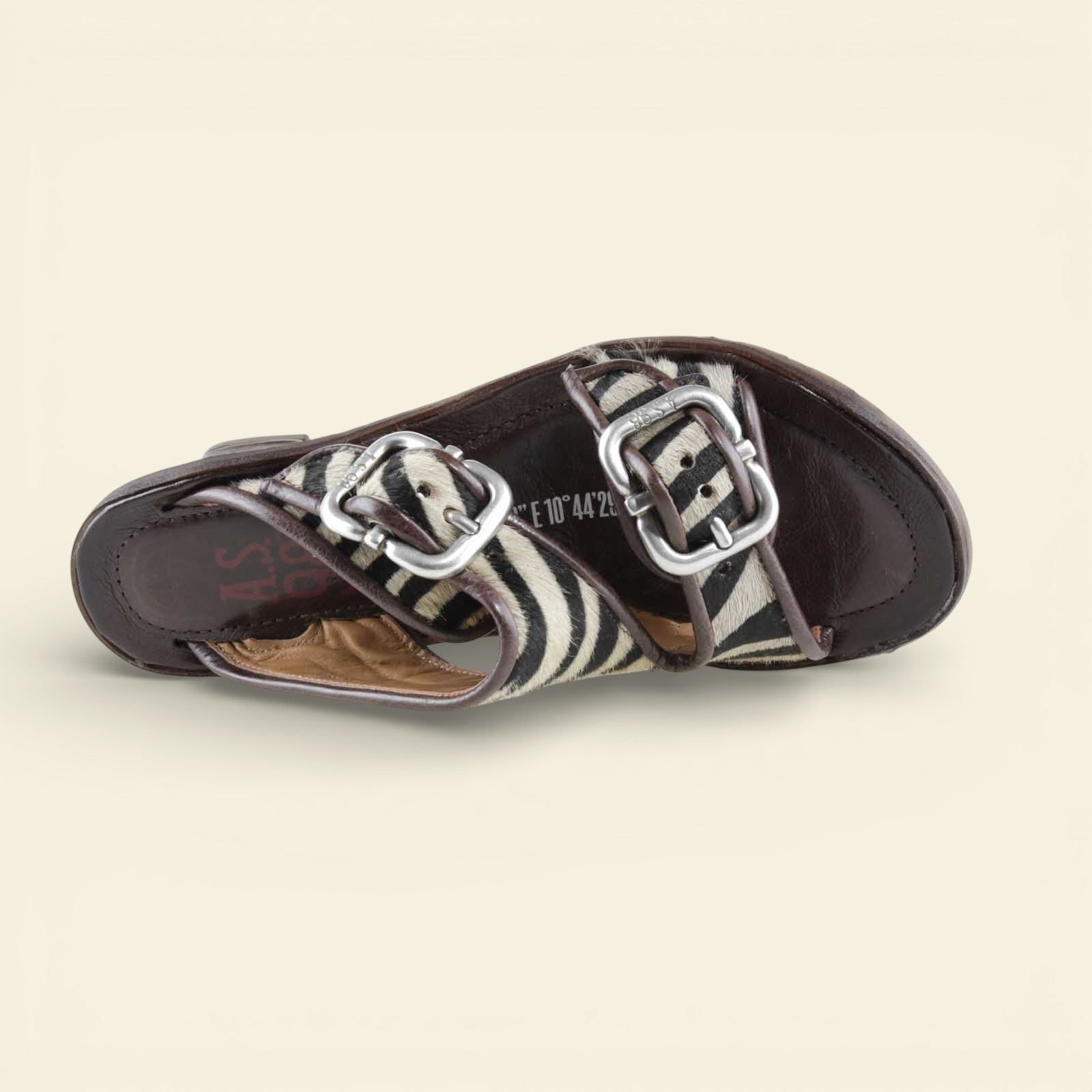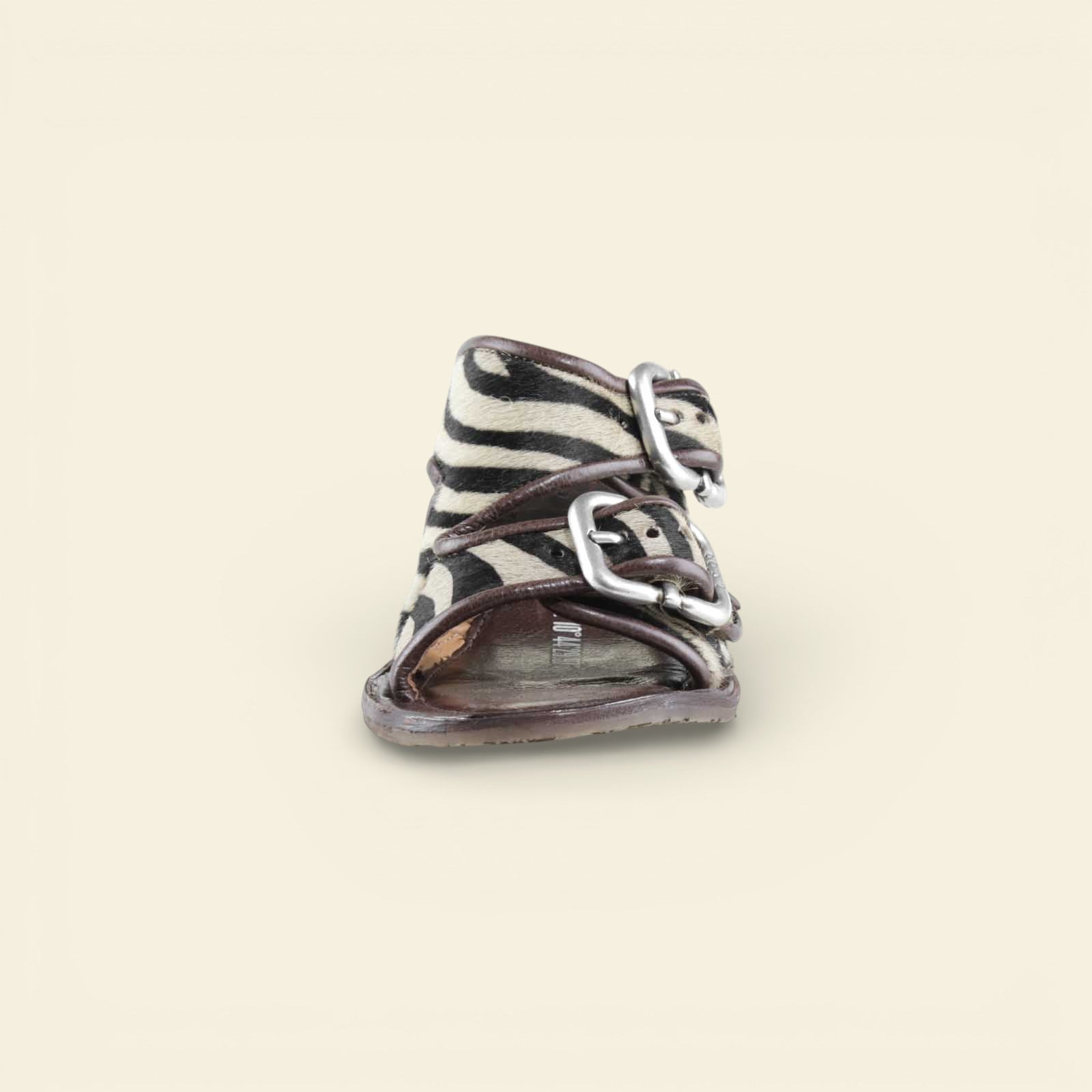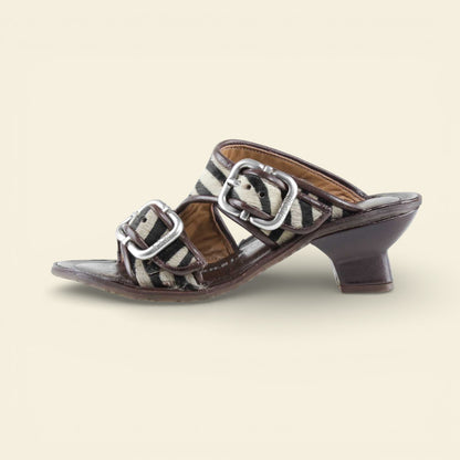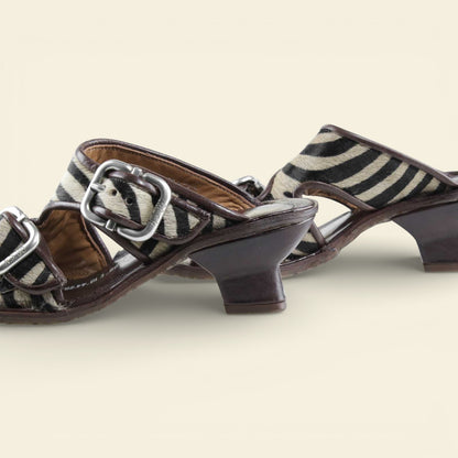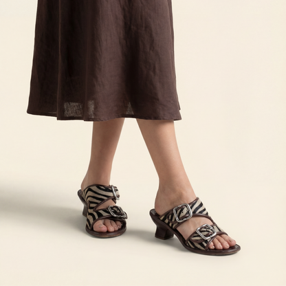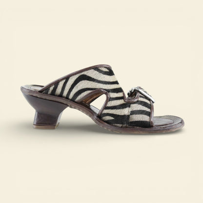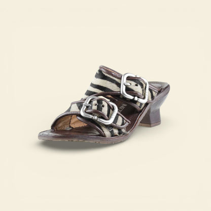 he ZEBRANO by A.S.98 is a bold statement sandal that blends Italian craftsmanship with modern edge. Designed in premium leather and finished with striking zebra-print hair-on detailing, this elevated slide features oversized metal buckle hardware and a sculpted mid-heel for confident everyday wear.