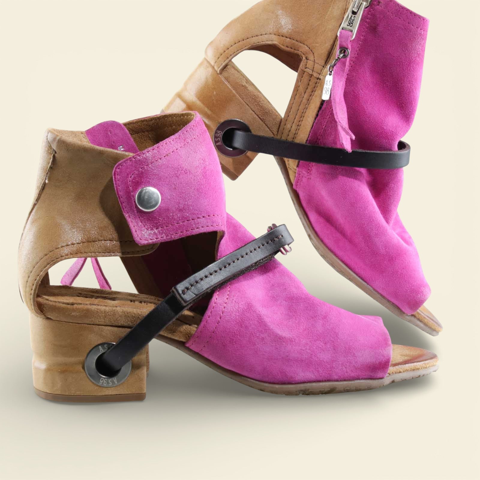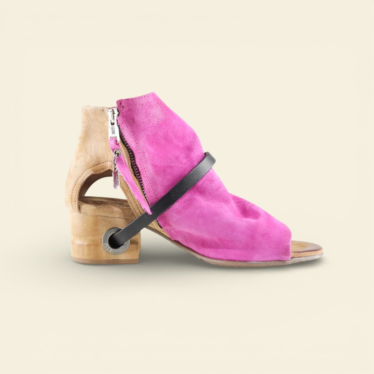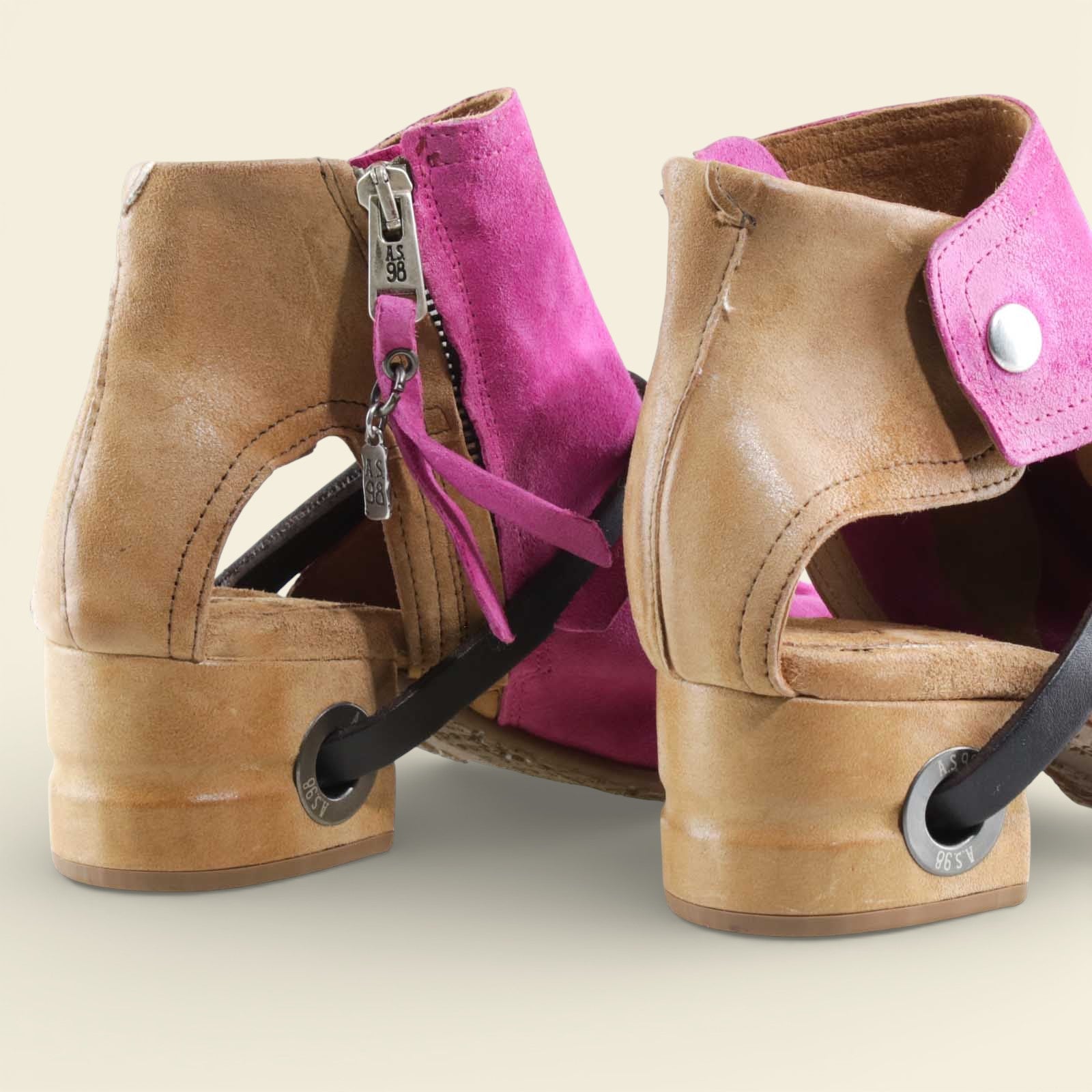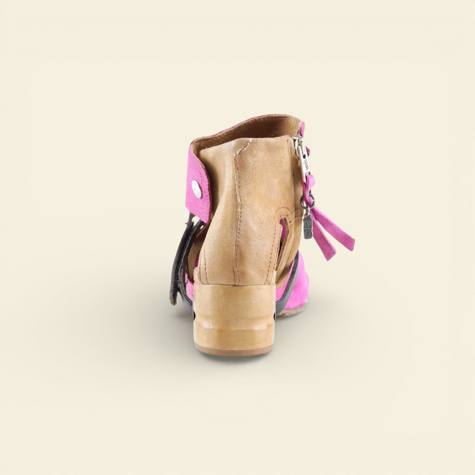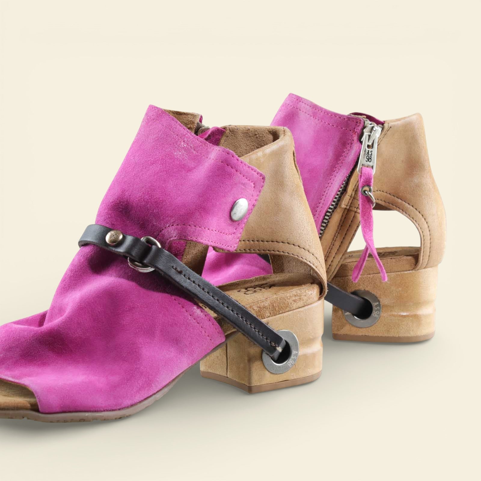 The FANTASIA by A.S.98 is a bold Italian-crafted sandal bootie designed for statement styling. Made from premium hand-finished suede and leather, this open-toe silhouette features architectural cutouts, a sculpted stacked heel, and signature A.S.98 hardware detailing.