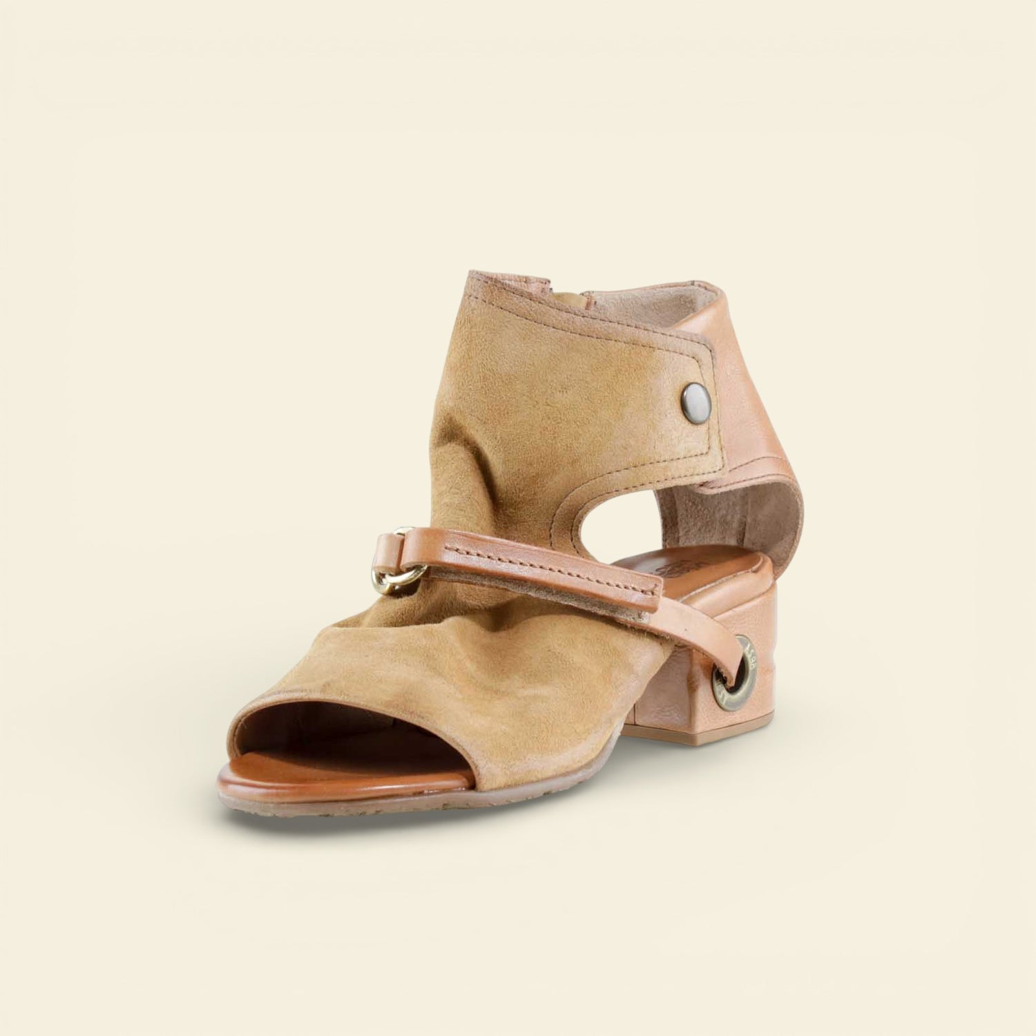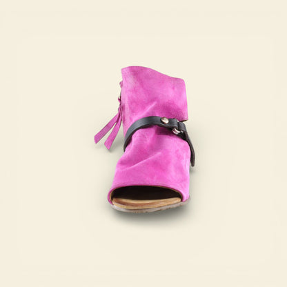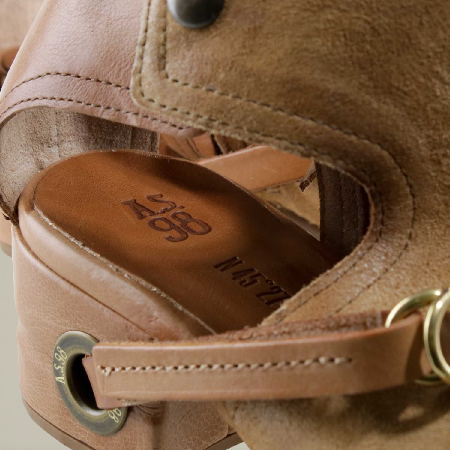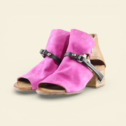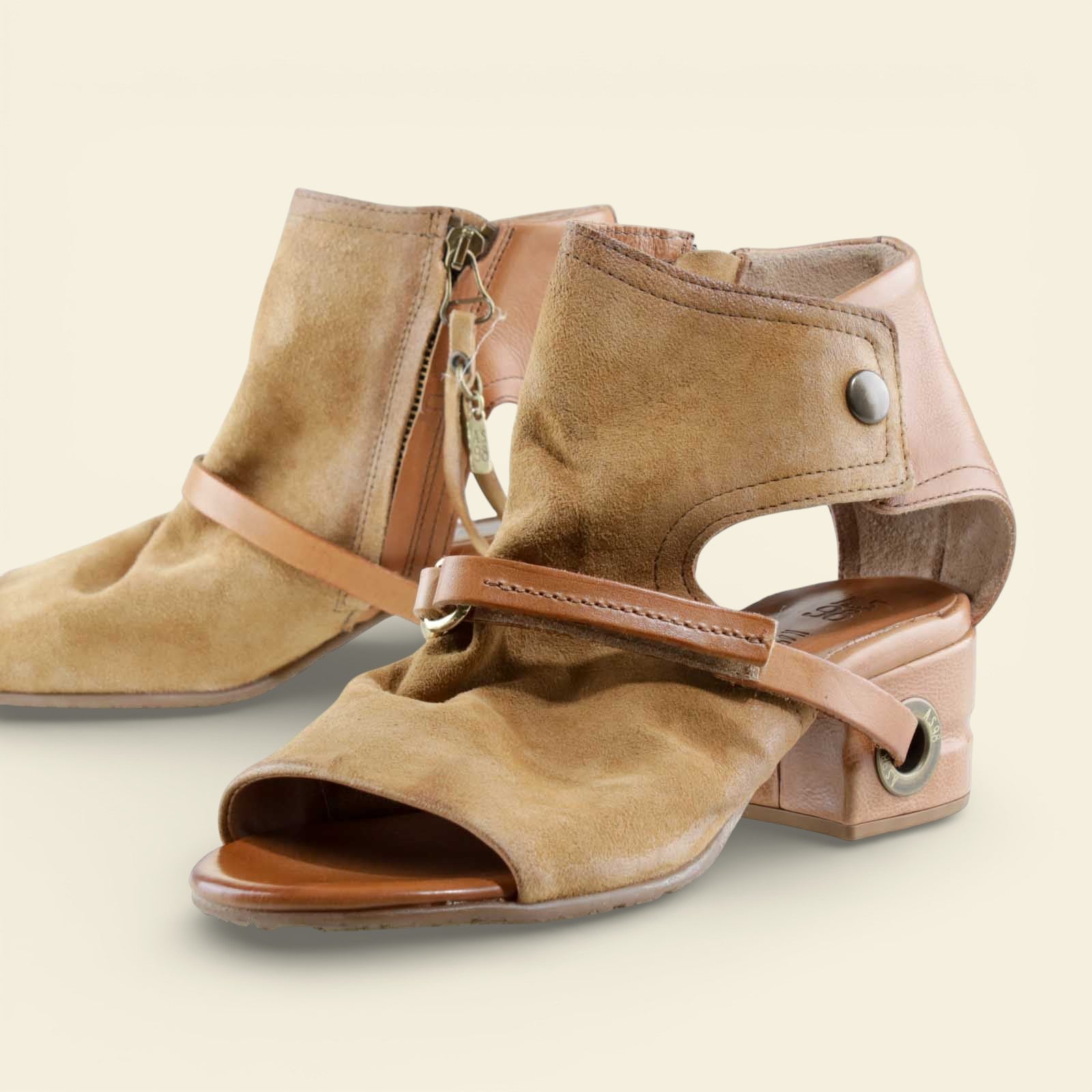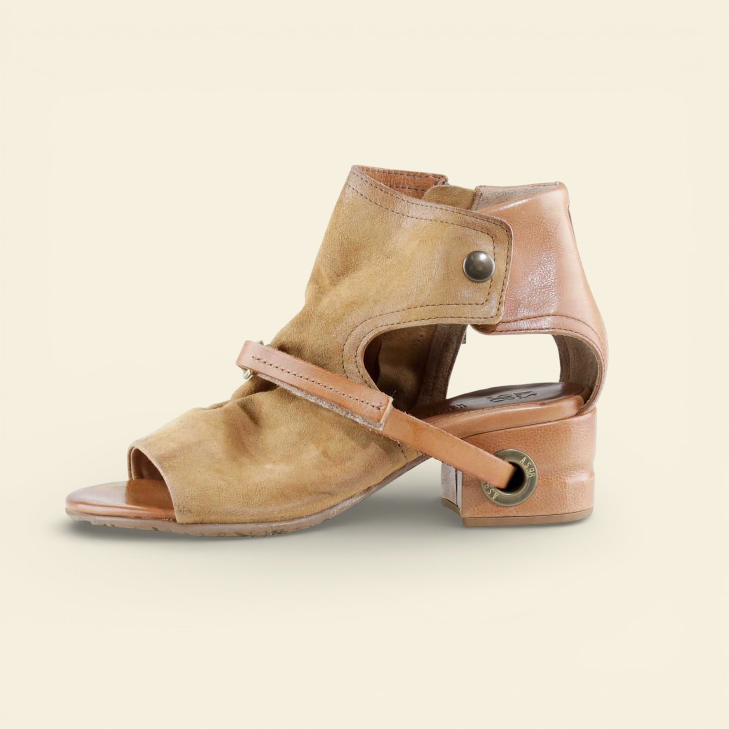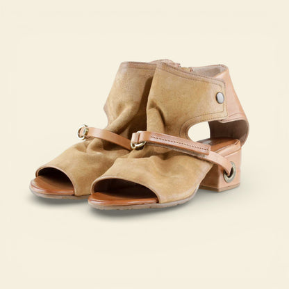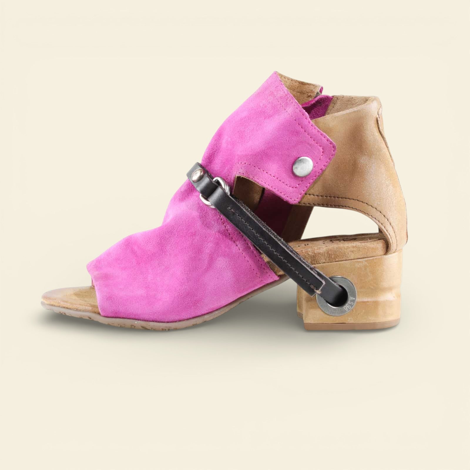 The FANTASIA by A.S.98 is a bold Italian-crafted sandal bootie designed for statement styling. Made from premium hand-finished suede and leather, this open-toe silhouette features architectural cutouts, a sculpted stacked heel, and signature A.S.98 hardware detailing.