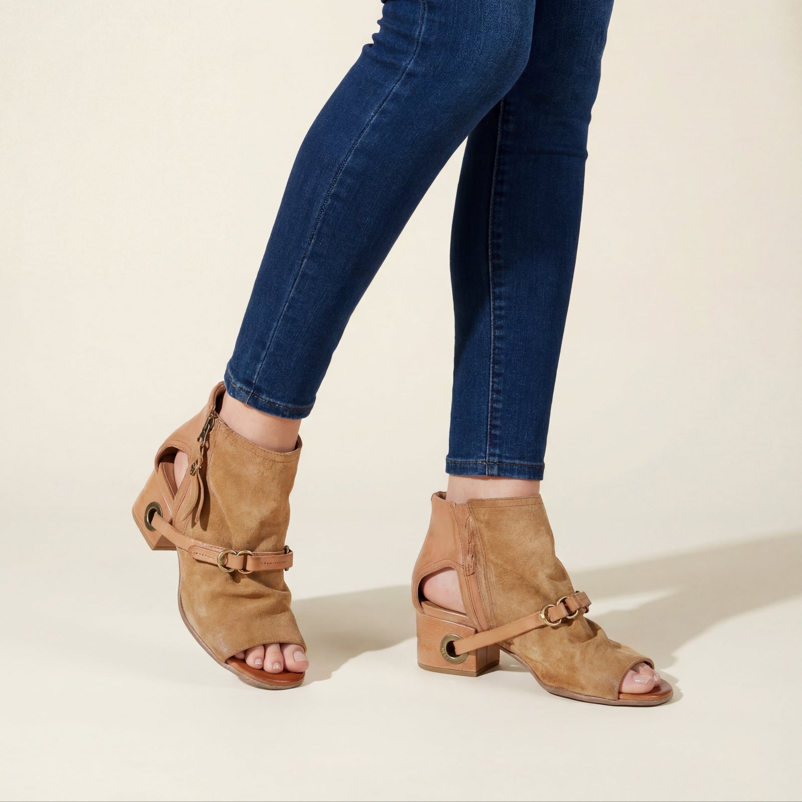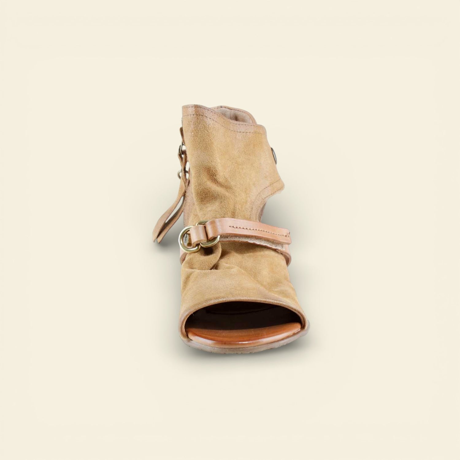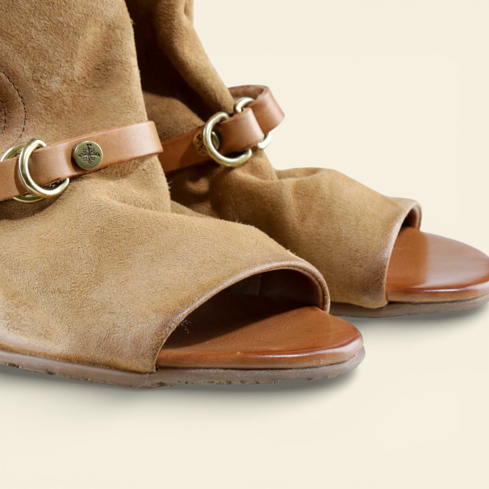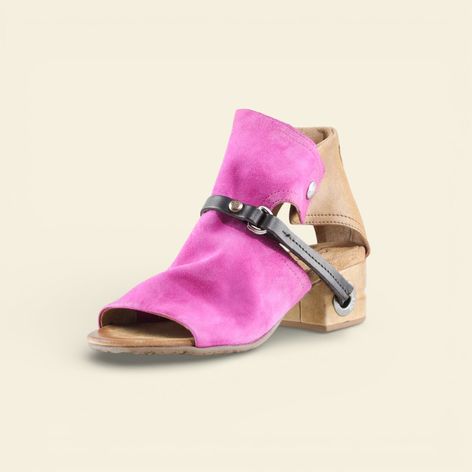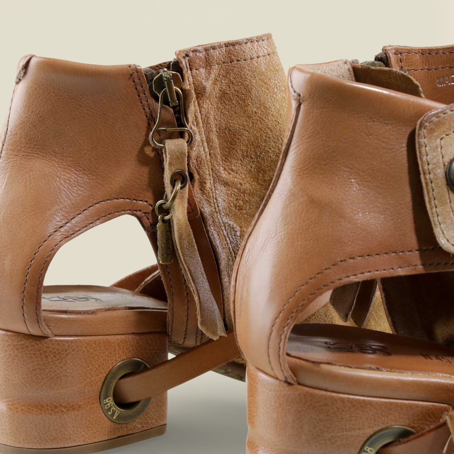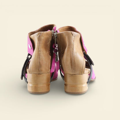 The FANTASIA by A.S.98 is a bold Italian-crafted sandal bootie designed for statement styling. Made from premium hand-finished suede and leather, this open-toe silhouette features architectural cutouts, a sculpted stacked heel, and signature A.S.98 hardware detailing.