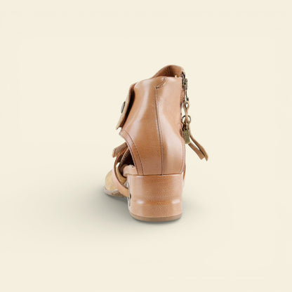 A side zipper allows for easy entry, while the adjustable leather strap with metal ring accent adds structure and visual edge. The open sides provide breathability, making FANTASIA ideal for transitional dressing from spring through early fall. The stacked heel offers comfortable lift while maintaining stability for everyday wear.