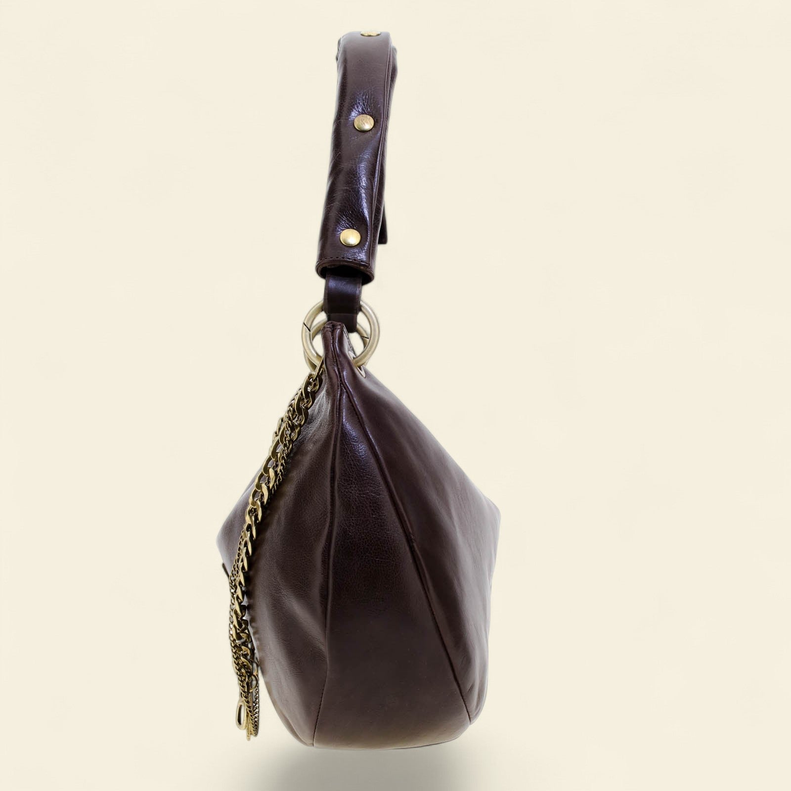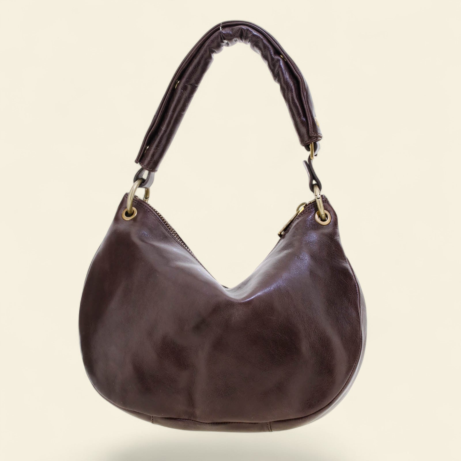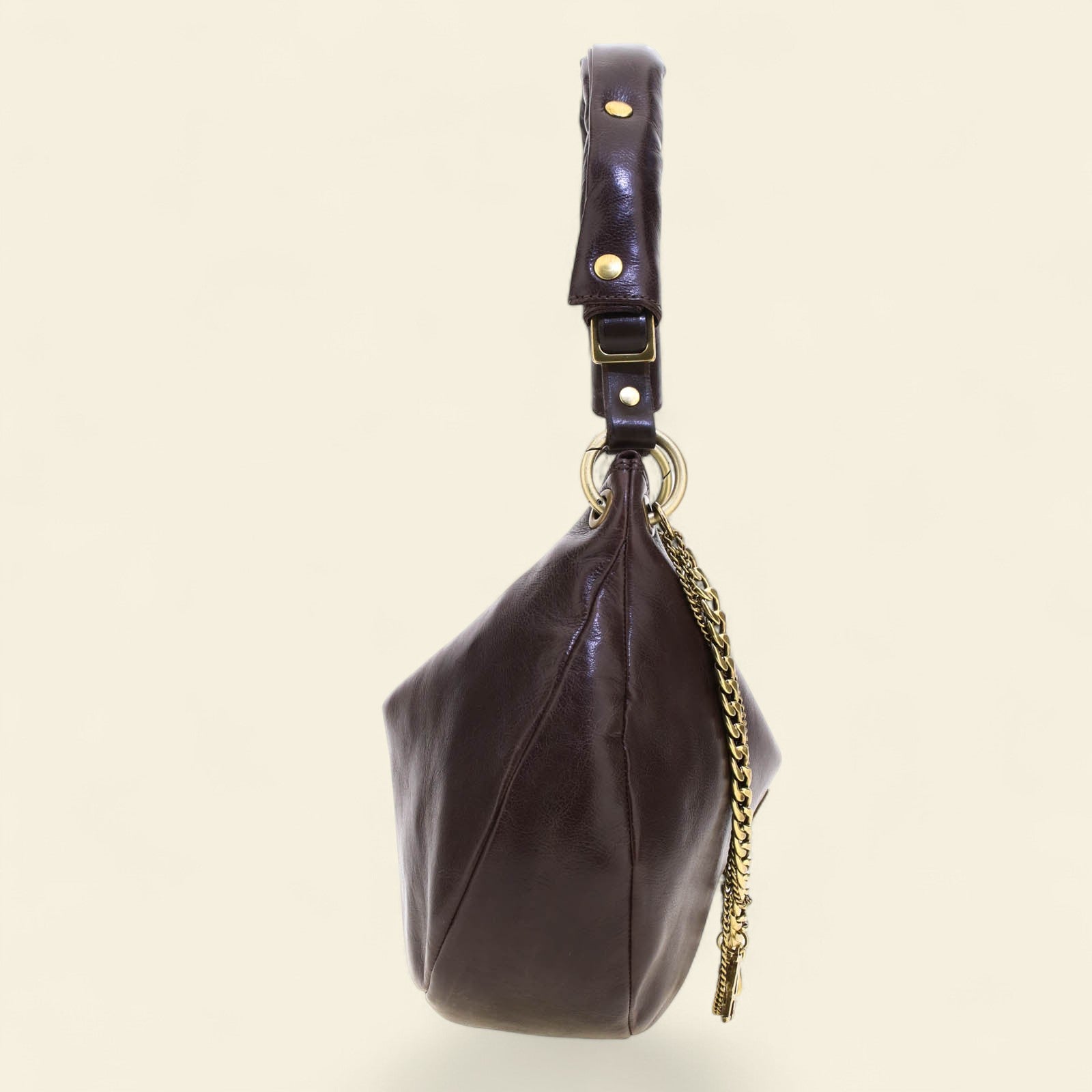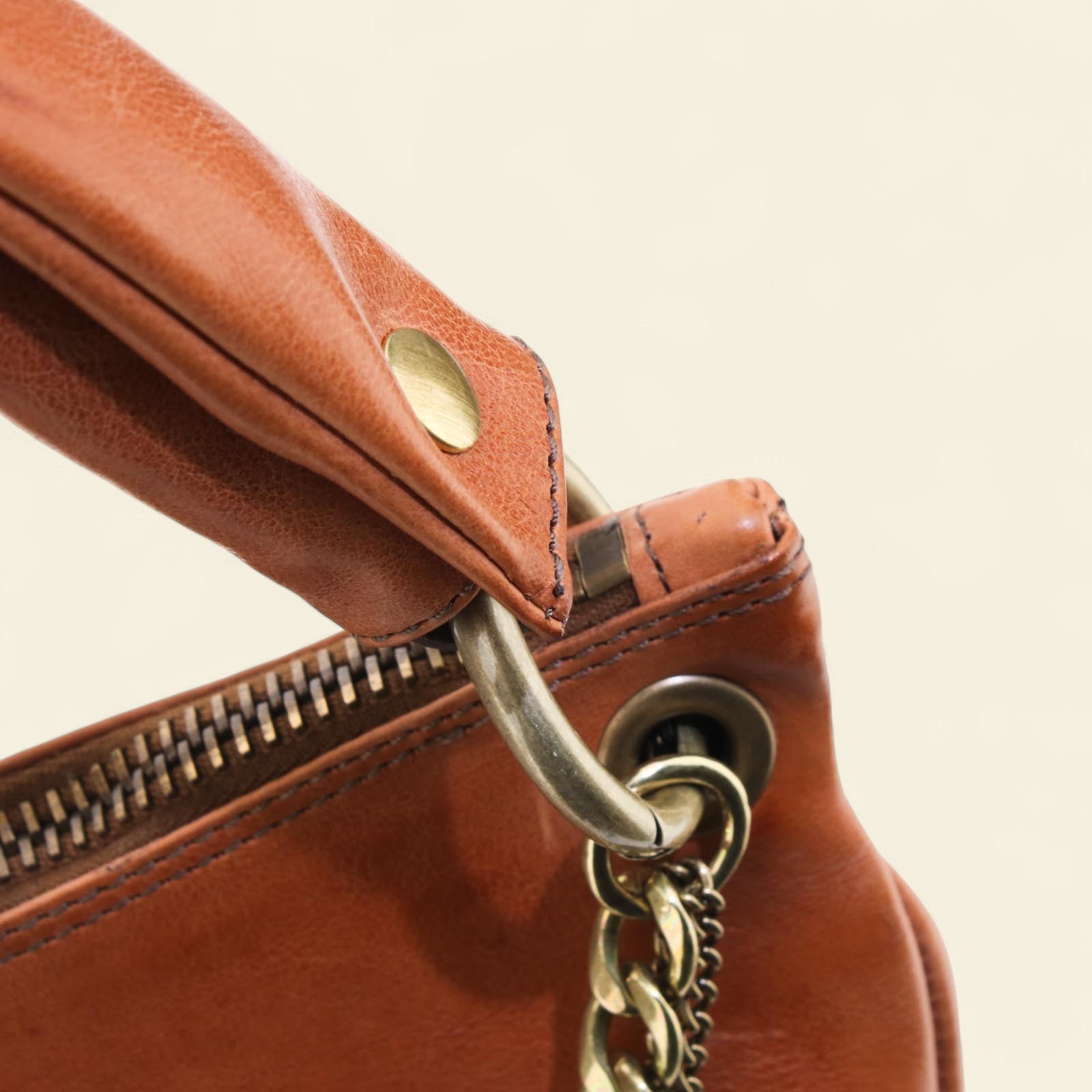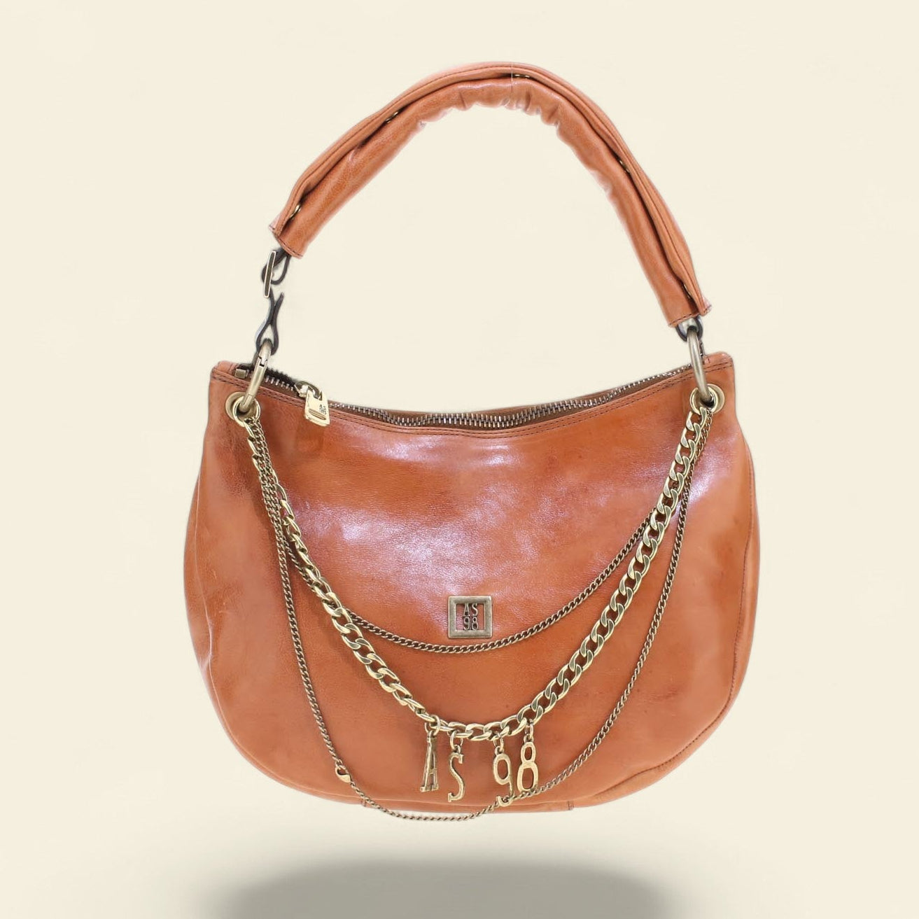 The Jones bag by A.S.98 is crafted from premium Italian leather, combining contemporary elegance with a bold attitude. Its half-moon silhouette and rich cognac tone make it a refined yet versatile choice for everyday wear. The softly structured body and antique brass chains with A.S.98 charm add a distinctive, artisanal touch—signature to the brand’s craftsmanship.